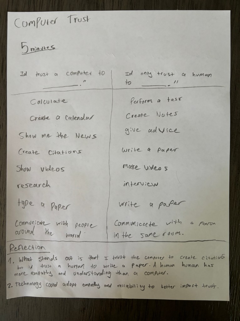 For the exercise I had to fill in the blanks to the terms: “I’d trust a computer to fill in ‘blank’, but I’d only trust a human to fill in ‘blank.’ The catch was to think of words in under 5 minutes and then reflect about the words I chose. This exercise can be helpful when brainstorming ways a design can help the user compared to a human. So I have learned to use this process when starting out and brainstorming for a design and its inclusivity.