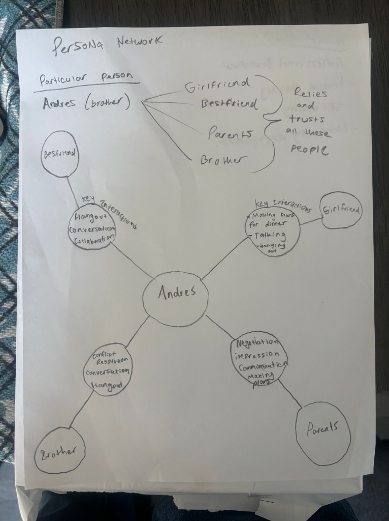 At first I had a hard time thinking about a person with difficulties in their environment, so I focused on my brother since he struggles with anxiety. I made a list of all the people he interacts with and created a concept map of the key interactions with each person. With his anxiety, he had mismatches when communicating with parents and brother. However, he felt very comfortable with friends and girlfriend. Using a concept like this can be helpful for me when considering mismatched interactions for my future designs, and seeing how certain qualities in people can make it more comforting when incorporated into a design.