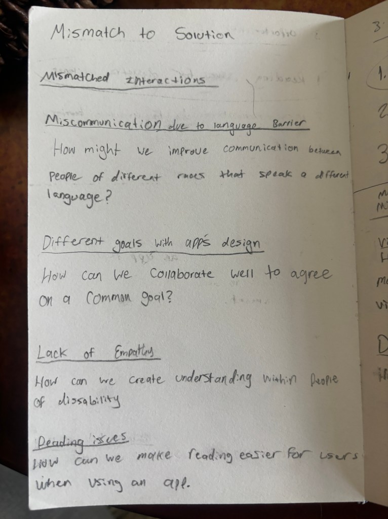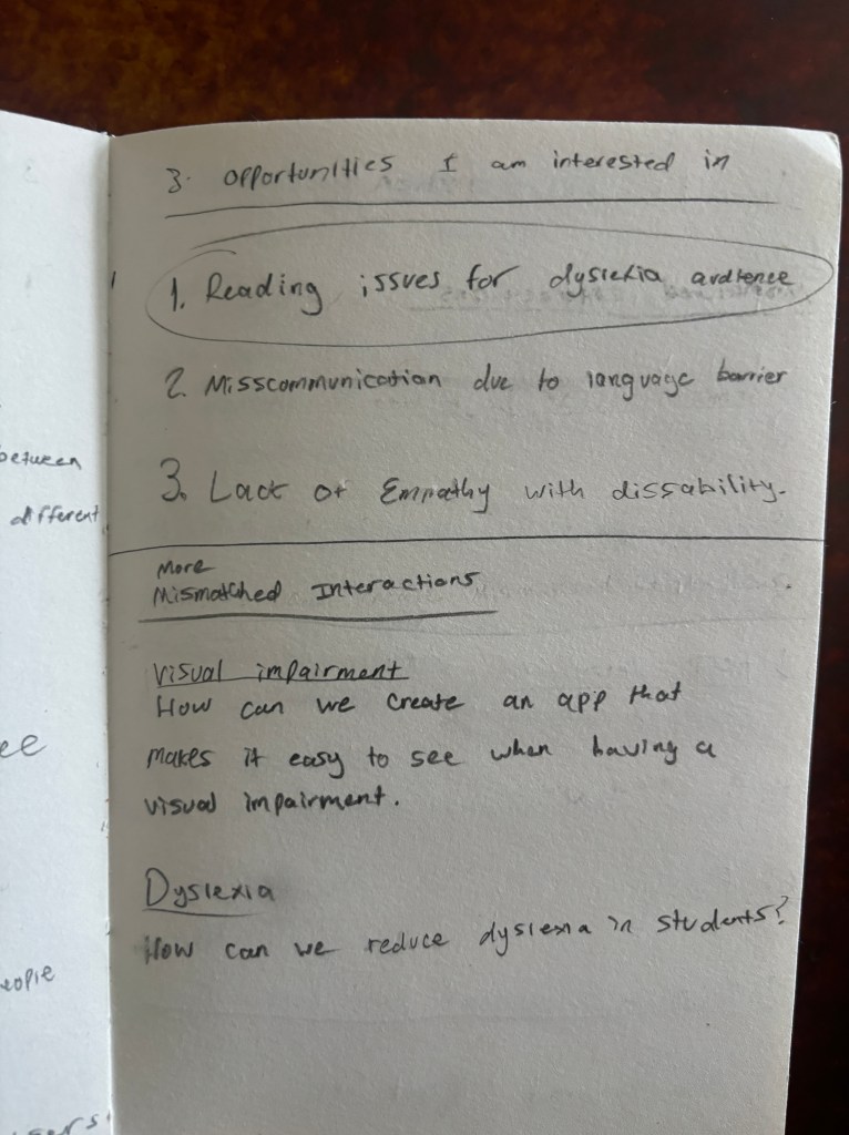 I listed mismatched interactions I could think of and produced a question for each topic. Then I had to list my top choices. I ended up choosing reading difficulties and dyslexia mismatched interactions to consider for a design solution. Brainstorming mismatched interactions was a helpful activity to come up with ideas to tackle these problems directly.
