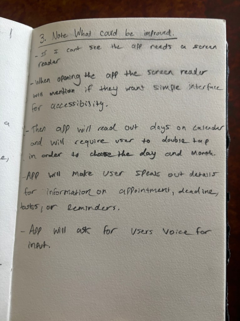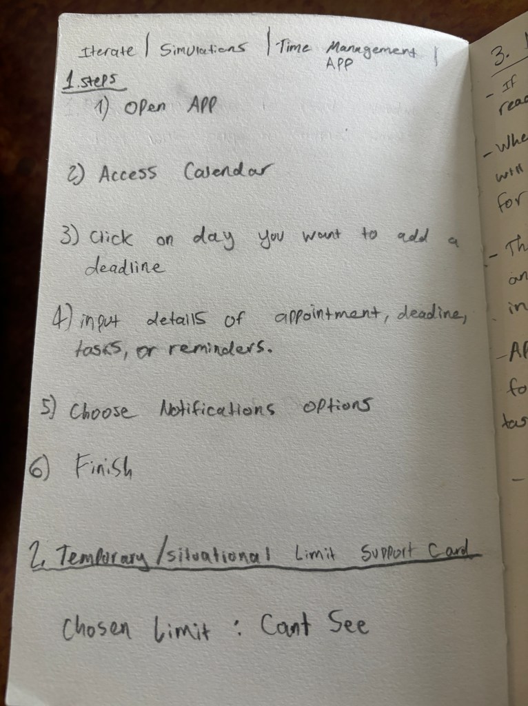For this exercise, I created steps for a conceptual calendar app that helps with time management and scheduling for dyslexic people. The assignment then made me choose a situational limit card which was that the person can’t see. I then went through the steps again and noted what could be improved. I noted that adding a text to speech function would solve this issue as well as simplifying the User Interface. That way it is more inclusive for people facing situational limits. This can be useful for future designs because it refines the design to cater to a larger audience, expressing empathy and inclusivity for all.
