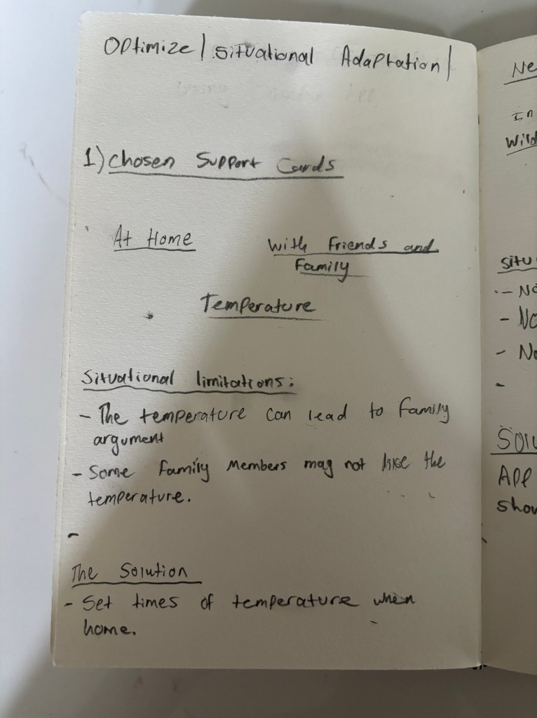 This exercise helped me come up with different situational limitations based on environmental factors. I first chose to do at home, with family and friends with temperature. This created interactions where the temperature would bother some of the family members and cause argument. The solution I proposed was to have certain times where the temperature would change for a certain family member.