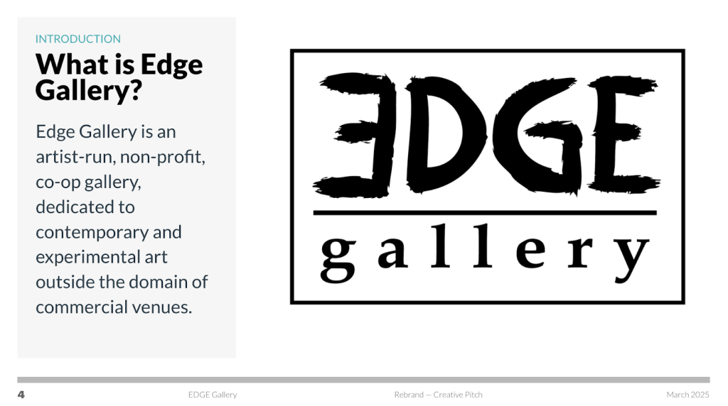 I, Alberto Flores, contributed by exploring Edge Gallery’s mission, vision, and values statements. I researched other galleries in Downtown Denver starting with the most popular such as Meow Wolf to the non-profits like Redline Contemporary Art Center. When it came to creating our first pitch presentation, I developed slides and proposed new logos, colors, typography, and messaging for the gallery’s rebrand. After we received the decisions from the clients, I refined the logo they chose and displayed it on our revised proposal. After hearing their response, I began to research potential website hosting providers they could switch to later on depending on their budget. Since they wanted to stick with a free website, I ended up choosing WordPress.com. I then developed a redesigned website with a cleaner and modern style that fits well with the brand’s new identity. When we worked on the brand style guide, I helped by creating the logo guidelines and structuring some slides for the presentation. I actively communicated and collaborated effectively with my teammates and brought up suggestions, concerns, and questions throughout the entire process.