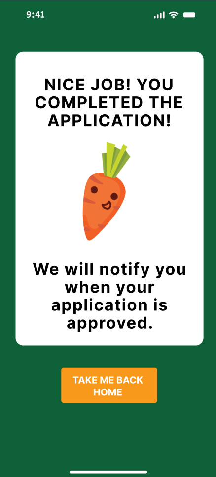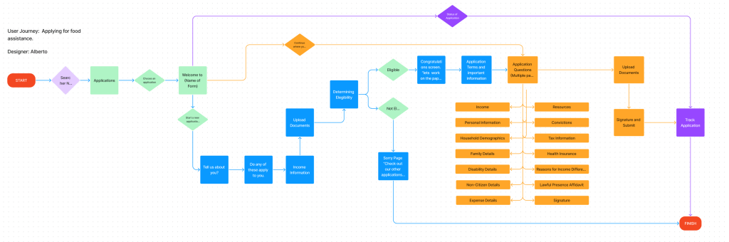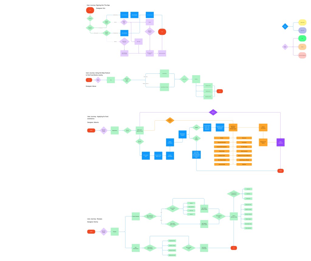 The flowchart was a combination of all of our respected features. We used this for the startup sign up process, map, recipes and application features. The entire flowchart ended up being huge making it a little hard to read. My section in the chart focused on how I wanted the application feature to work. It would welcome the user to the form and ask some questions about them to determine their eligibility. Then it would streamline simple worded questions asked by the actual governmental form to make it easier for the user to complete it. I also had ideas to make it able for the user to save their progress or check on the status of it.