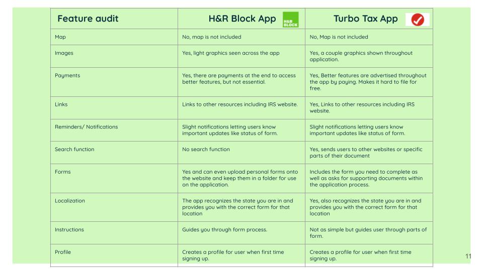 For the competitive analysis, I decided to focus on the two tax filing applications known as H&R Block and Turbotax. I compared their differences, similarities and things they could improve. I found that H&R Block makes it easier for the user to file taxes, but Turbotax is more efficient and accurate. We also created a feature audit to compare every app we chose for the entire app and looked for features like maps, payments, forms, and more.