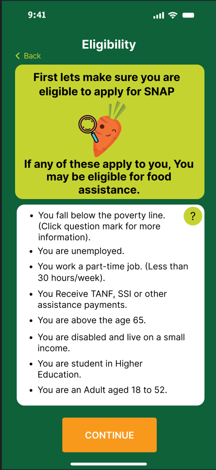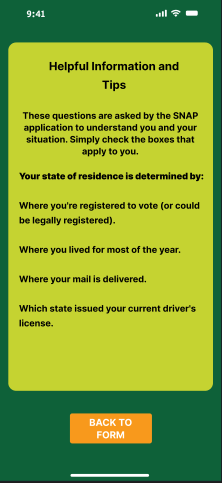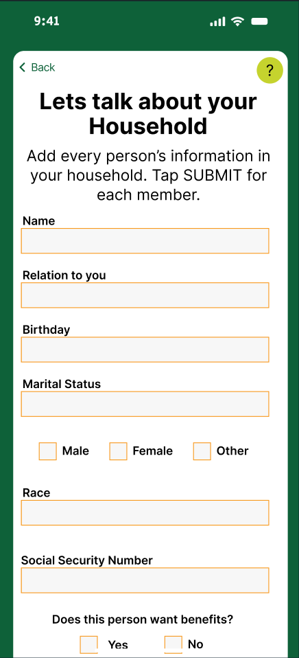 Since this was a group project, I contributed in ways that helped with the collaboration and completion of the app. I developed sketches on how I envisioned the app to look like, which appealed to my teammates. We all chose to work on a specific feature and I chose to work on one that helps users sign up for the SNAP form. We hopped on a website called Figjam and created a flowchart together, I added mine to represent how I wanted the form feature to work. I would create and start documents for my group such as the competitive analysis, project proposal, and UX before/after deck. I would be asking questions on the direction of the project and providing potential ideas for the design.