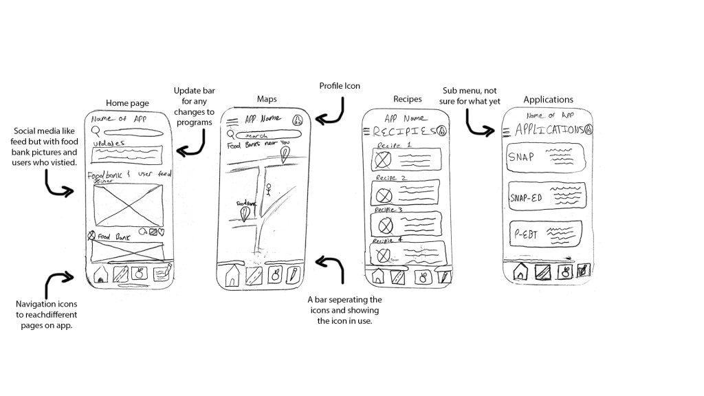 When we were brainstorming ideas on how we wanted the design to look like, I scouted through different apps on my phone and found inspiration from the social media platform Instagram. I decide to reflect my sketches on this app with the vision to be used as a food bank resource. I thought about creating a newsfeed for foodbank providers, a map to find food resources, a recipe page to create cheap home meals, and an application sign up feature. It felt a bit ambitious to some group members, so we scrapped the newsfeed and simplified some elements.