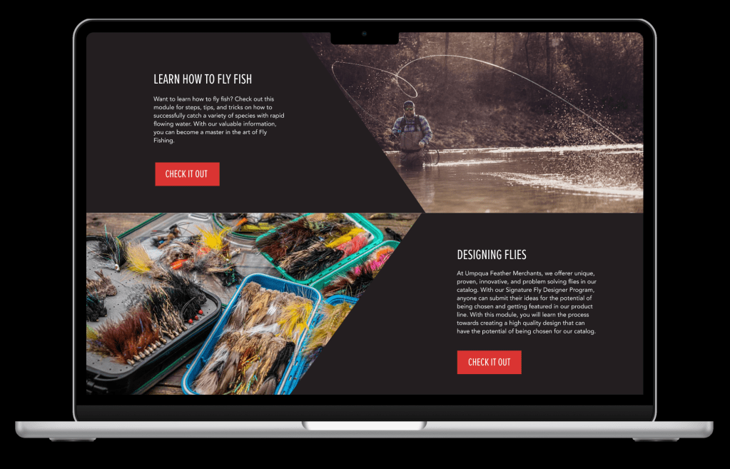 Umpqua Feather Merchants is known to offer the highest quality flies from the country’s best tyers. They have grown the Umpqua family to include 240 of the most influential tyers whose flies push the envelope of creativity and success. Umpqua continues to drive innovation and carry that same inspiration from flies – into hook design, pack innovation, fly storage and the tools we use at the riverside (About us). Employees at Umpqua have to constantly sell to retailers and learn about new products that are new or upcoming. They have to always be up to date with updates, products, and customer service. With the vast amount of fly designs coming throughout the year, employees may feel overwhelmed. These employees can enroll in an education portal that extends the company’s brand, and keeps them and their customers up to date with the latest product training, accessory training, selling tactics, competitor comparison and more. This will bring in more customers and influence employees to be informed and trained on the latest updates within the company. It will also be used to teach new dealers and employees everything they need to know about the brand.